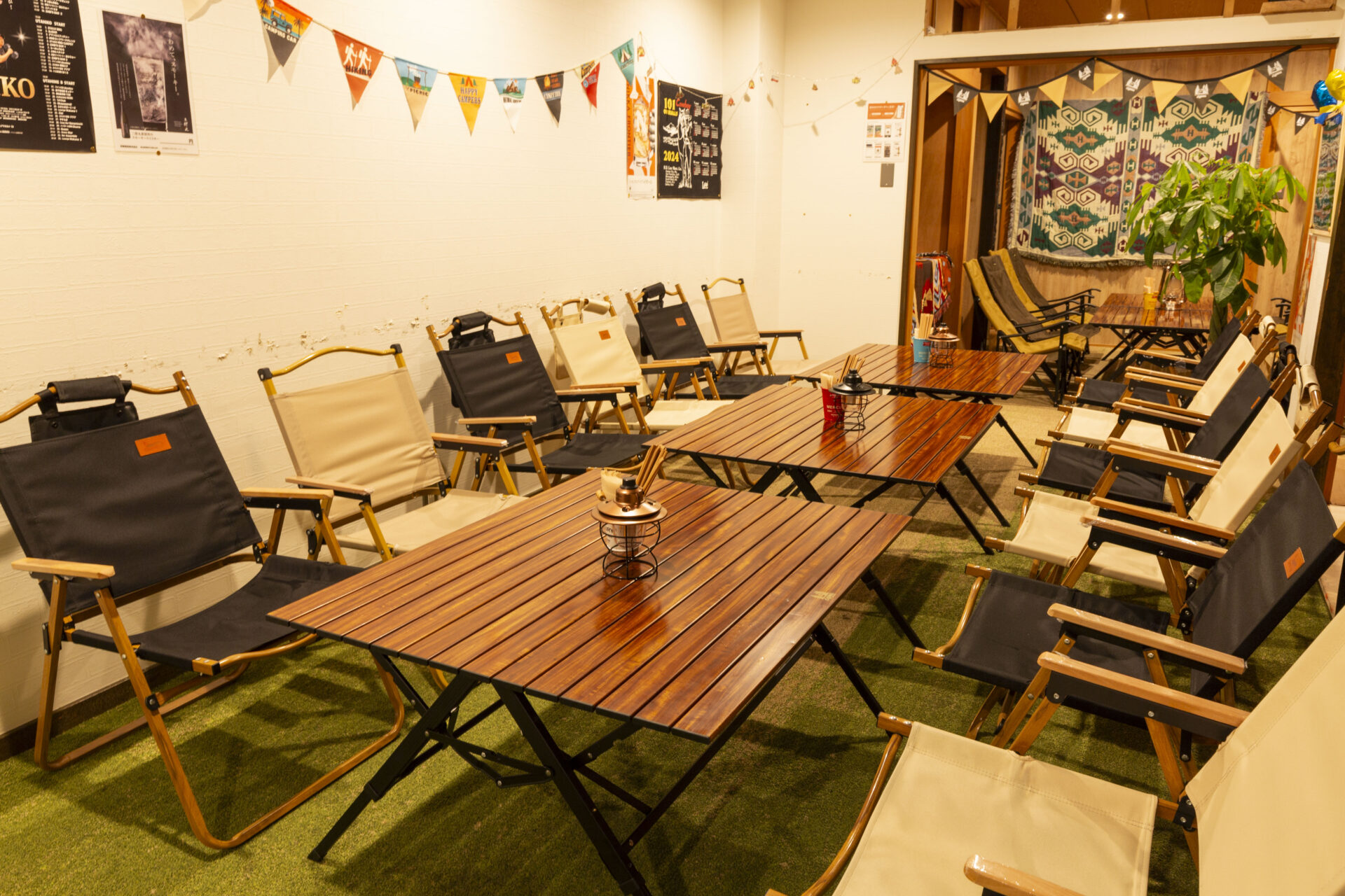 キャンプの雰囲気をより味わっていただけるよう、実際にキャンプで使用するギア(キャンプ道具)を店内に配置!飲み会や女子会、デートにおすすめの落ち着いた空間になっています。2階は20名様で貸切可能!1階にはおひとり様でも気軽に来店しやすいカウンター席がございます。